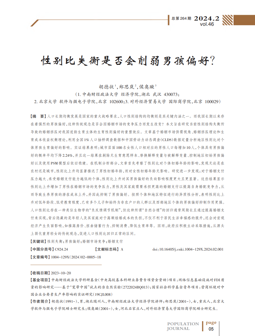 近日,永利官网2023届本科毕业生郑思岚、侯奥璇与其导师胡德状合作论文《性别比失衡是否会削弱男孩偏好?》在人口学领域重点期刊《人口学刊》2024年第2期正式发表,该论文为当期的第一篇文章。《人口学刊》是由吉林大学主办的双月刊,专门发表人口理论、人口政策、人口统计与分析等领域的研究成果,为RCCSE来源期刊、CSSCI来源期刊、全国中文核心期刊、中国人文社会科学核心期刊、国家社科基金重点资助期刊,属于永利官网认定的B类期刊。